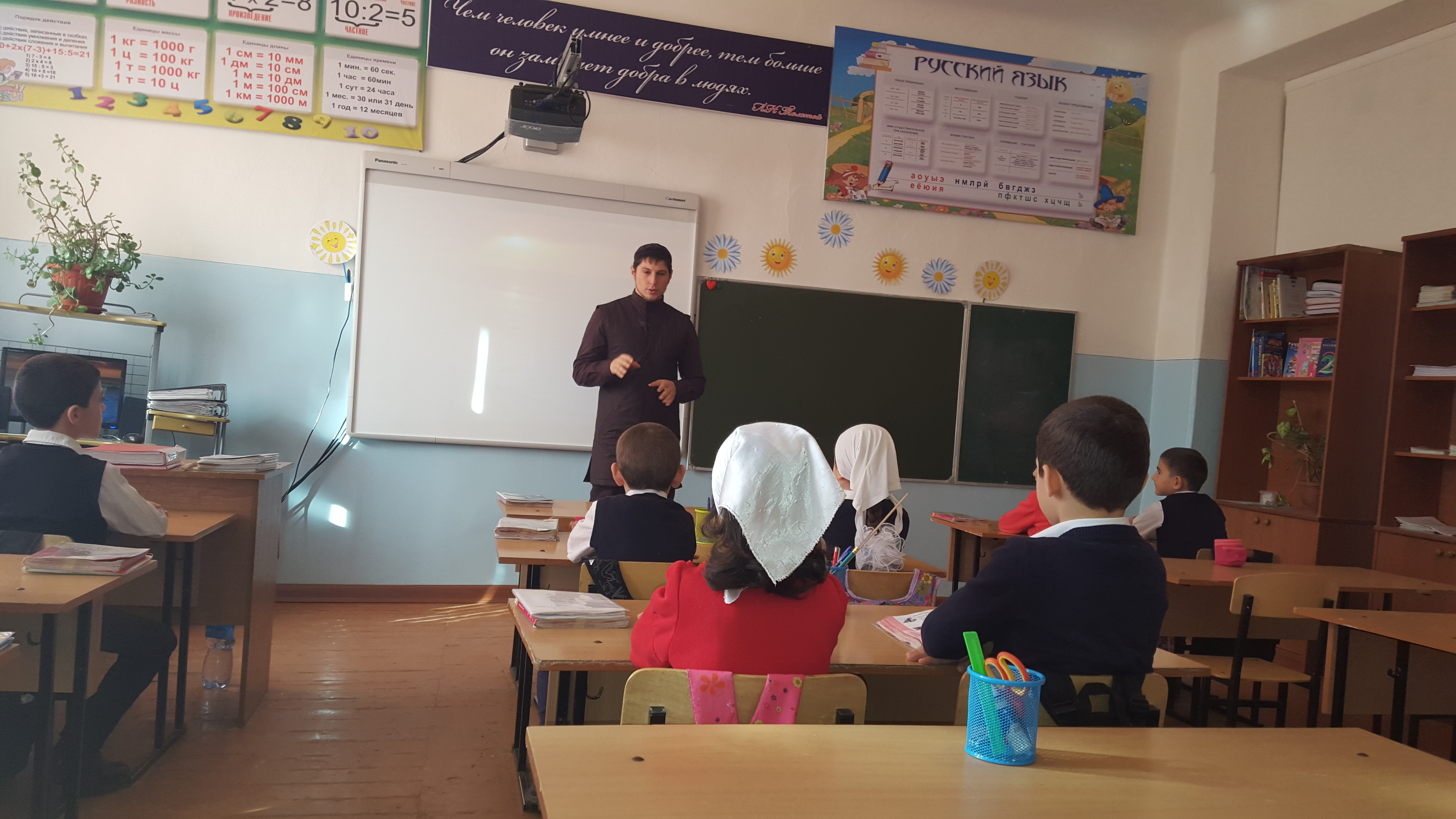 В рамках реализации Единой Концепции по духовно – нравственному воспитанию и развитию подрастающего поколения, с целью привития учащимся вежливого и уважительного отношения к учителям, в МБОУ «СОШ с.п. Бено-Юрт» 02.10.2015 года, среди учащихся 1 – 11 классов были проведены лекции и беседы на тему: «Ислам о роли учителя в духовно – нравственном воспитании и становлении личности». В настоящее время особую роль приобретают проблемы формирования духовного, нрав-ственного и физического здоровья подрастающего поколения, воспитания нового типа граждан – истинных патриотов, самостоятельно мыслящих, активно действующих, облада-ющих интеллектуальным потенциалом и нравственными принципами. И в связи с этим, определяющее значение в духовно - нравственном воспитании придаётся религиозному образованию. Приведем в качестве примера некоторые аяты из Корана:«Поистине те, кто уверовал и творил добрые дела, – им Милосердный дарует любовь». Сура «Марьям», 96 аят «И совершивший добро даже весом с пылинки увидит его». Сура «Аль – Зальзалат», 7 аят и хадисы: «Не относится к общине моей тот, кто не уважает старших среди нас, не жалеет младших и не отдаёт должное тем, кто обладает знанием» (Ат-Тирмизи), «Поистине луч-шими из вас являются самые благонравные» (Аль-Бухари и Муслим). Под словом «благо-нравие» подразумевается любое достойное нравственное качество, украшающее, очищаю-щее и возвышающее человека. Пусть Всевышний Аллах наградит нас за наш труд, терпение и настойчивость в поис-ках знаний и добродетели! Амин