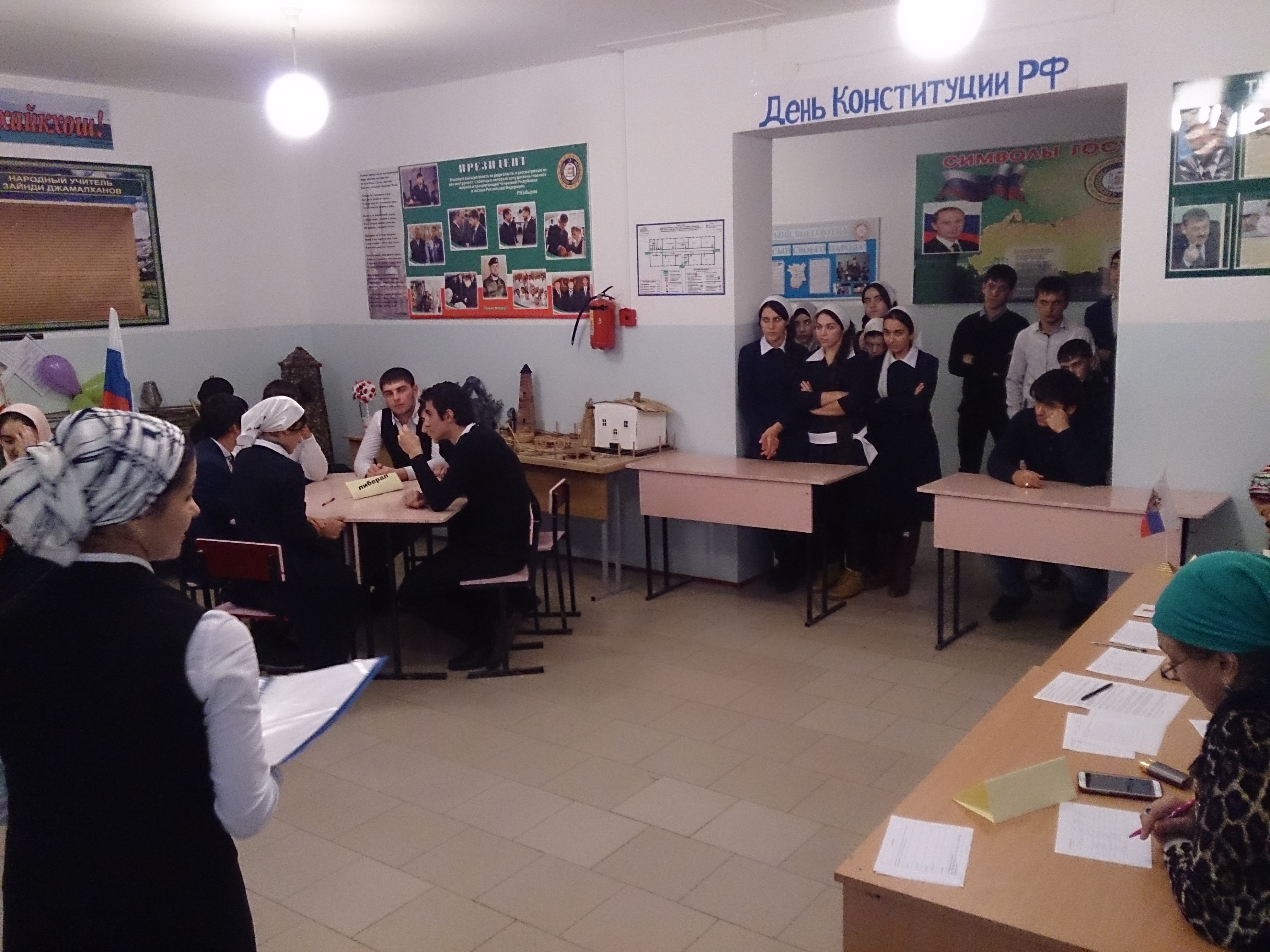 В честь празднования Дня Конституции РФ в МБОУ «СОШ с.п. Бено-Юрт» были проведены следующие мероприятия:-Были оформлены фасады зданий баннерами и плакатами.-классные часы на темы: «День Конституции РФ», «По закону нравственности»-школьной редколлегией оформлена стенгазета «День Конституции РФ»-общешкольная викторина «Знай Конституцию своей страны»-открытый урок на тему: «Главный закон страны»Администрацией школы были оформлены здание школы баннерами и плакатами.Учитель истории и обществознания Усманова М.Б. провела в школе викторину на тему: «Знай Конституцию своей страны».Классные руководители 5-9 классов провели классные часы на темы: «День Конституции РФ», По закону нравственности»Учитель истории и обществознания Азизова З.М. провела открытый урок на тему: «Главный закон страны».